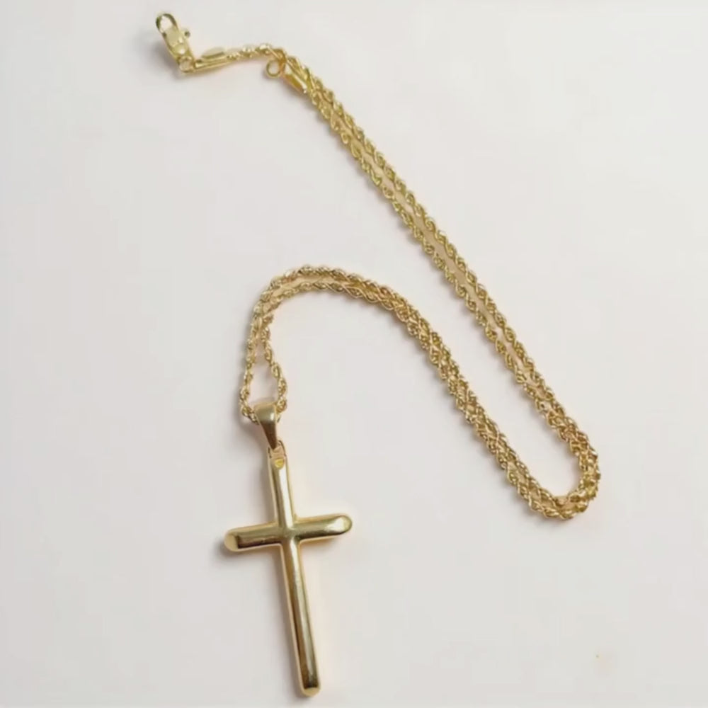 Rope Chain Necklace with Cross Pendant in 24K Gold, 3mm 18",20", Unisex